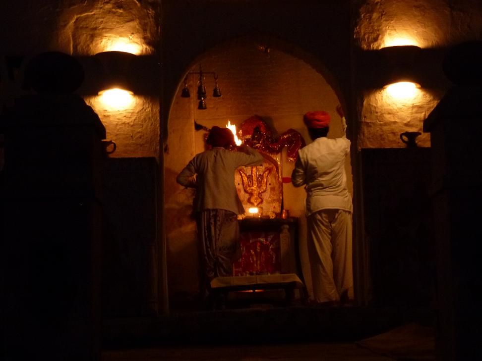 A ritual performed morning and night in temple on hotel grounds in small village of Narlai by the tribesmen who