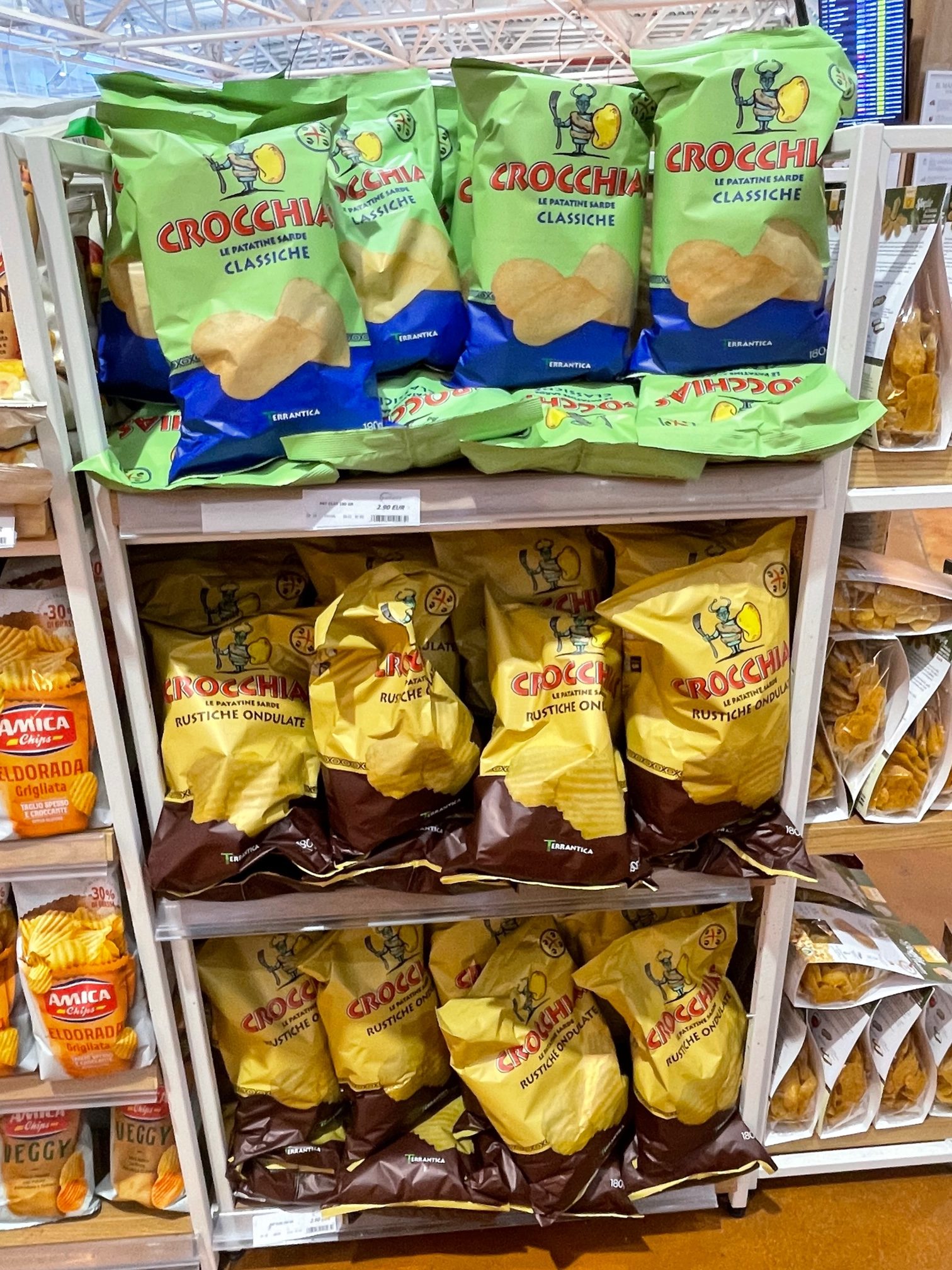 My go-to in Italy are the Crocchia “ondulate” chips. They’re like Ruffles, the chips served with French onion dip at many a summer picnic at my grandparents’ house, but better.