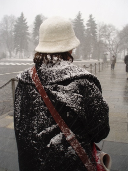 Snow fell suddenly from behind us at the Kremlin. This was the beginning. At the end Joan Gurry looked like a snowman!