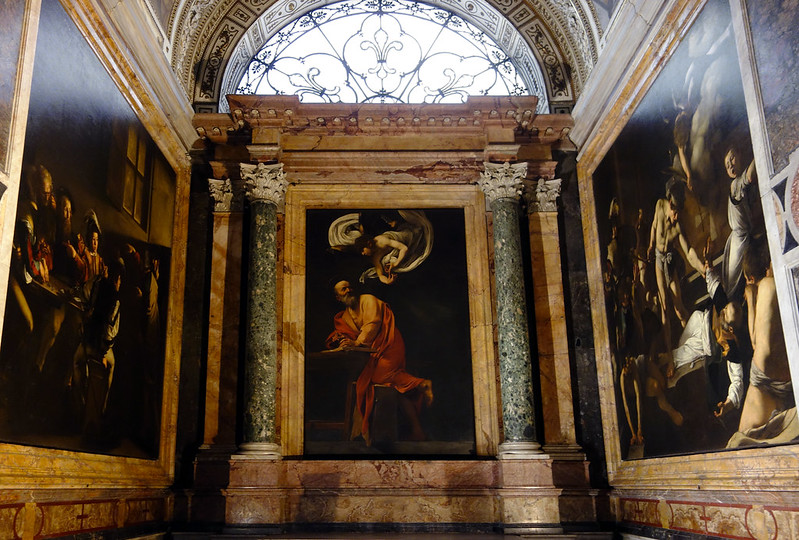 Sara would also remind us that it’s critical to see the work as a viewer would. The Calling of St. Matthew is part of a series of three paintings by Caravaggio on the life of the saint; they are hung in the space they were designed for: the Contarelli Chapel of San Luigi dei Francesci (St. Louis of the French), near the Piazza Navona in Rome.