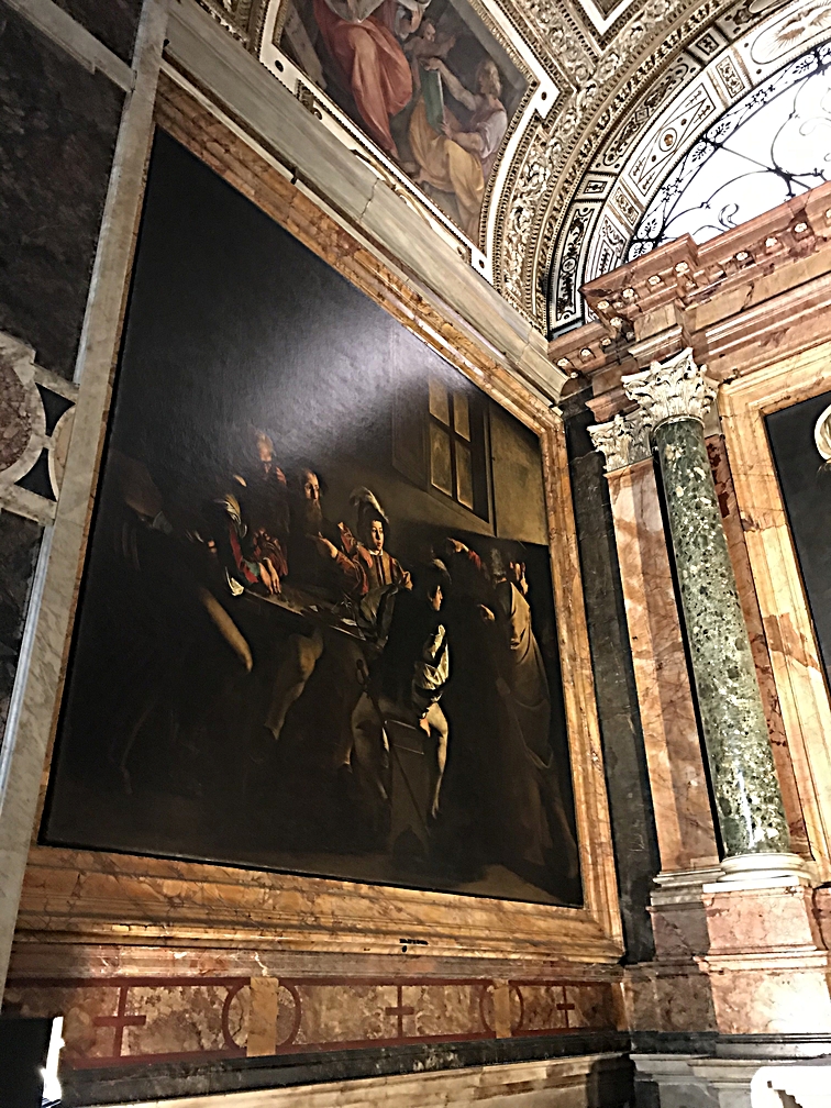 Sara would point out that because the chapel was private, most 17th-century viewers would, like us, only have the opportunity to see the two side paintings (Matthew’s calling and his martyrdom) from a diagonal viewpoint. But we’re not at a disadvantage because we can’t see them head on. Caravaggio knew how pilgrims to San Luigi would be looking at these paintings from outside the chapel proper and composed them accordingly. Sara would also say there is another light source on the painting you would not see when looking at it in, say, a book: the light from the window above the central painting, which is itself above the altar.