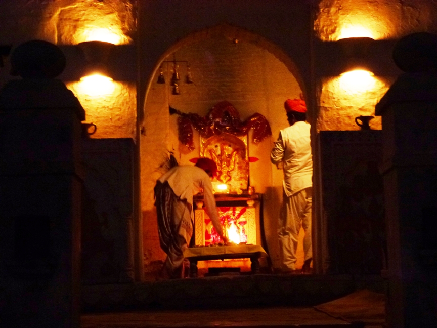 Arti is also celebrated in intimate ways, as seen here at a private shrine for the hotel staff in the village of Narlai.