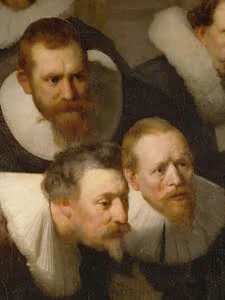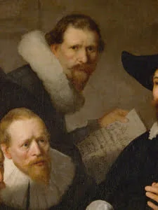 But what draws me into this painting most is the enthusiasm of the students as they push in close to see the demonstration. What a variety of attitudes! Most look at Dr. Tulp’s demonstration or the large anatomy book. Three of the men look out directly at us. The man on the left turns his head as if to invite us to join him. The man in the background (detail below) holding the book twists to stare out at us. The effect is powerful and dramatic and makes us feel we are there, alive to the moment, with the students.
