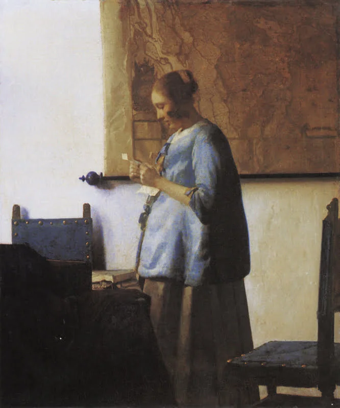 In Woman Reading a Letter, Vermeer creates a sense of intimacy by placing the woman in a contained space within a geometric composition. The table and chair stand between us, so she seems to inhabit a space we cannot enter. Yet we are invited into her inner world as we wonder what is written in the letter and how she feels about it. At the same time, the light from a window and the map allude to the larger world outside. It is fascinating how her face and hair seem to merge into the map, perhaps a metaphor for exploration and discovery. I have visited the Rijksmuseum in Amsterdam many times. When I stand before the Vermeer paintings, I ask myself: “What would it be like to see this kind of beauty in real life, to live more like this?”